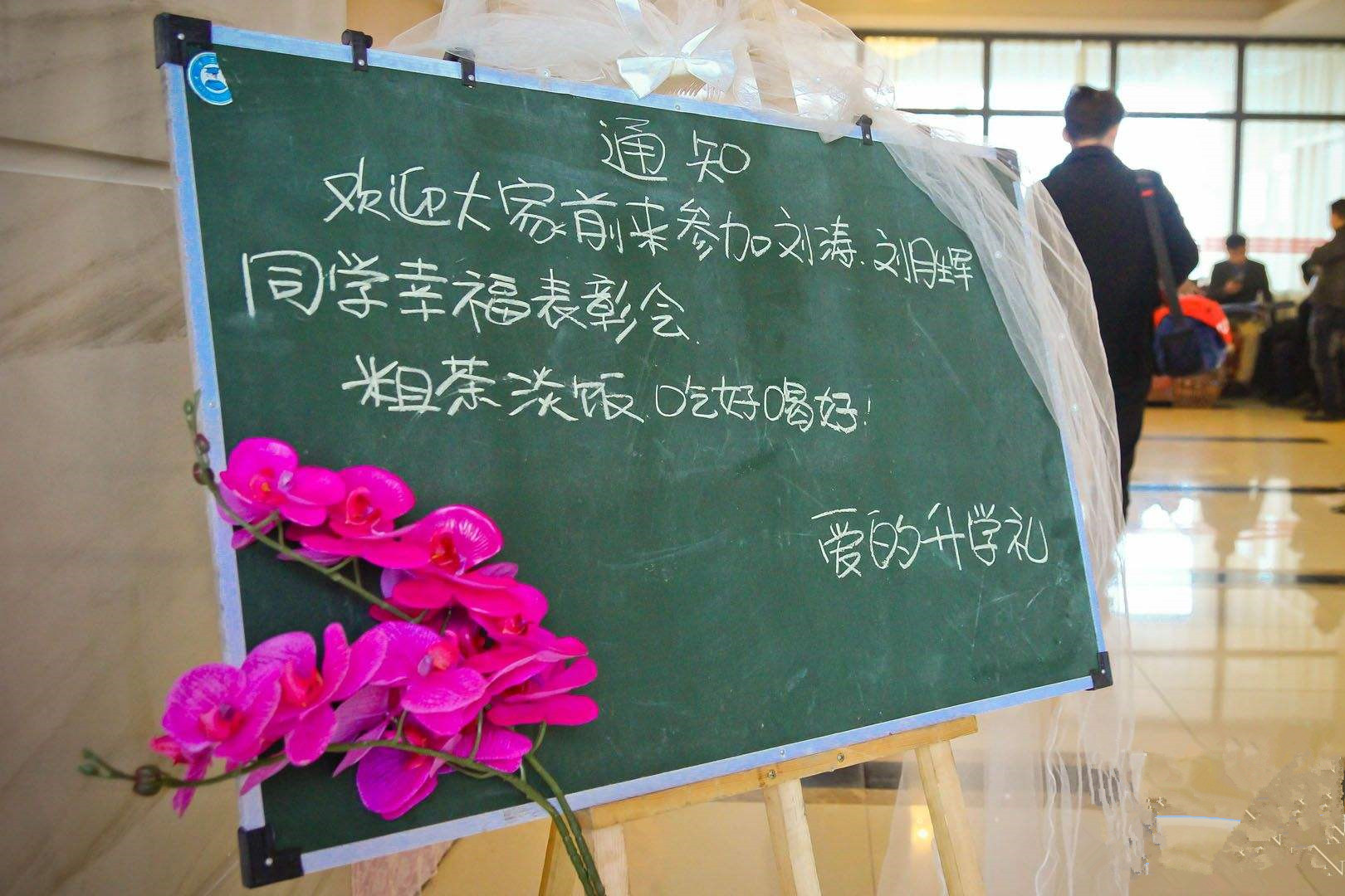 签到台可以是学生课桌组成,不需要太多的现代婚礼装饰品,反而可以放上书本、文具盒等学生时代的物品。签到簿可以是同学录或是一本学生时代的笔记本,宾客们在此签到并送上自己的祝福。
